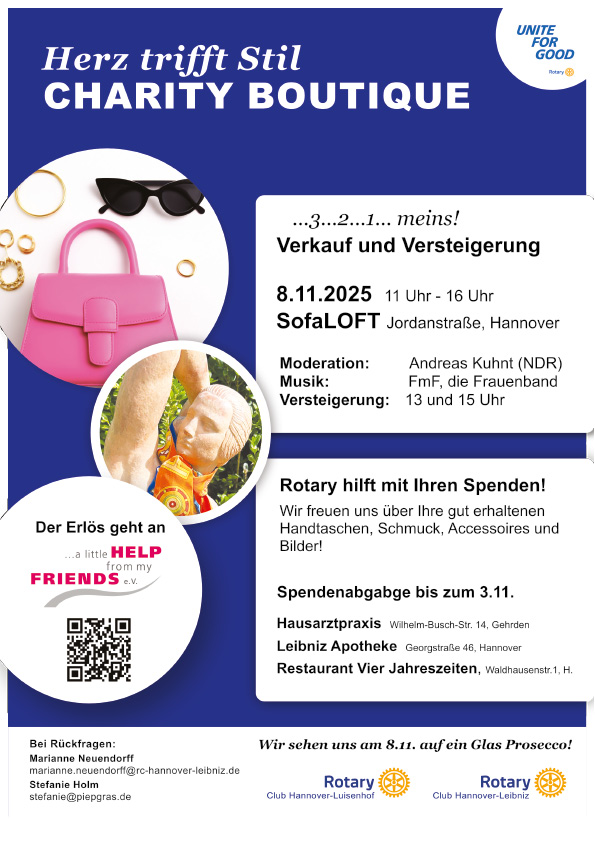 Die Rotary Clubs Leibniz und Luisenhof laden Sie herzlich zu einem besonderen Benefiz-Event ein: Freuen Sie sich auf eine exklusive Auswahl gespendeter Handtaschen, Accessoires und Kunstwerke, die zugunsten des Vereins „a little Help from my Friends e.V.“ verkauft oder versteigert werden. Der Verein unterstützt Hannoveranerinnen und Hannoveraner in akuter Notlage – direkt, unbürokratisch und mit