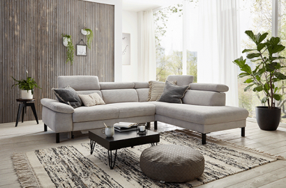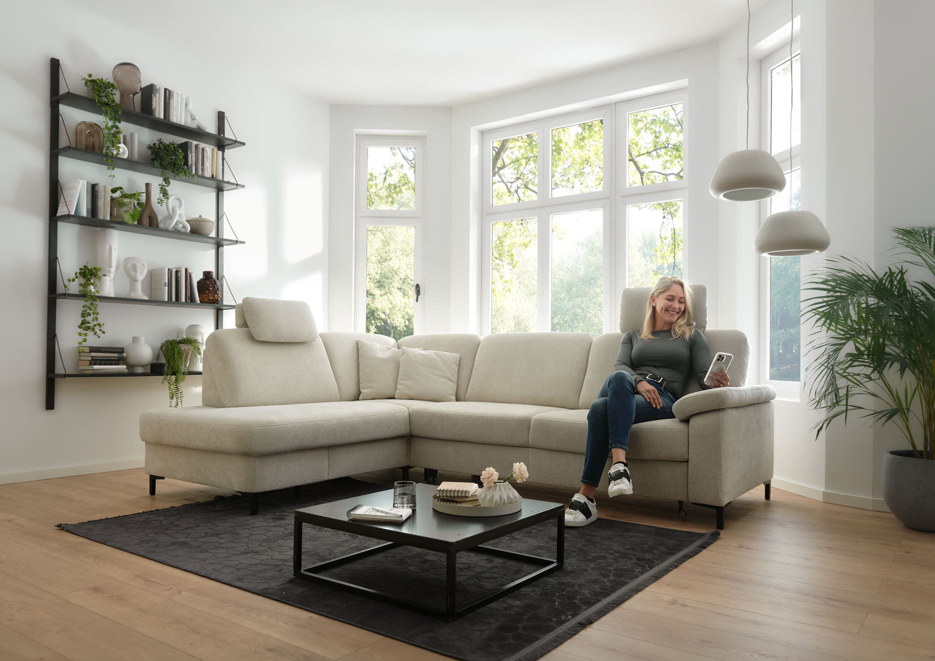 bestehend aus: 2,5 Sitzer mit Armlehne links | Inklusive manuellem Kopfteil | Eckelement als 1 Sitzer mit Abschlussteil rechts und manuellem Kopfteil | Metallfüßen in Schwarz matt | Auch spiegelbildlich bestellbar